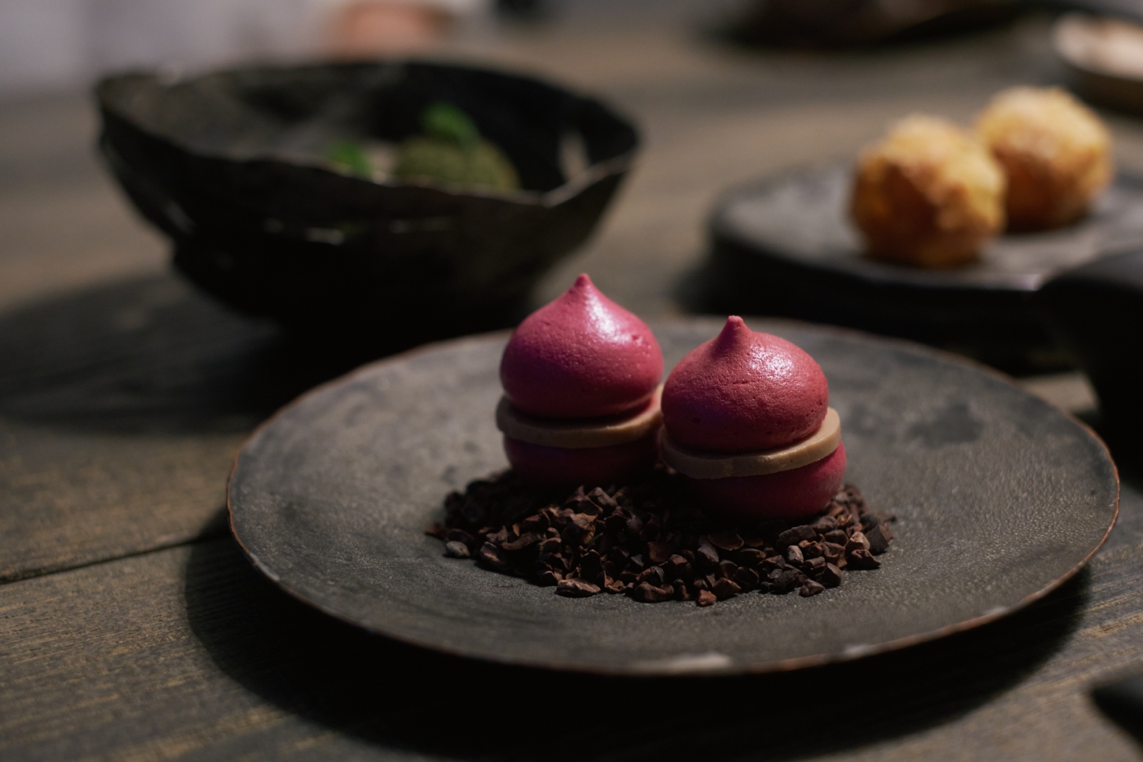 馬頭魚與馬鈴薯炸成綠色的球。粉紅色的甜菜根馬卡龍夾柔滑的雞肝慕斯,偏酸的調味,顛覆任何吃過馬卡龍的印象。